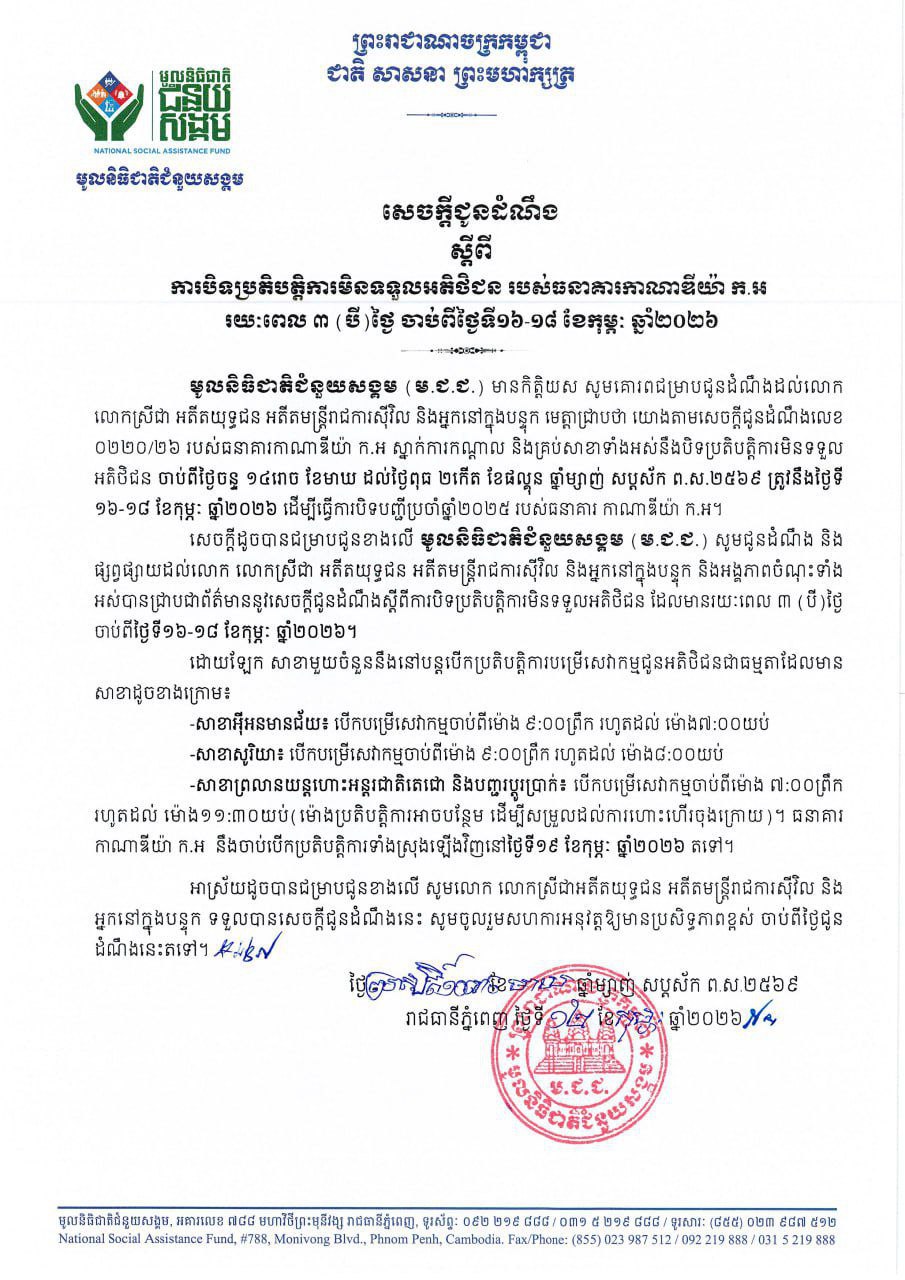 ស្តីពី ការបិទប្រតិបត្តិការមិនទទួលអតិថិជន របស់ធនាគារកាណាឌីយ៉ា ក.អ រយៈពេល ៣ (បី)ថ្ងៃ ចាប់ពីថ្ងៃទី១៦-១៨ ខែកុម្ភៈ ឆ្នាំ២០២៦។