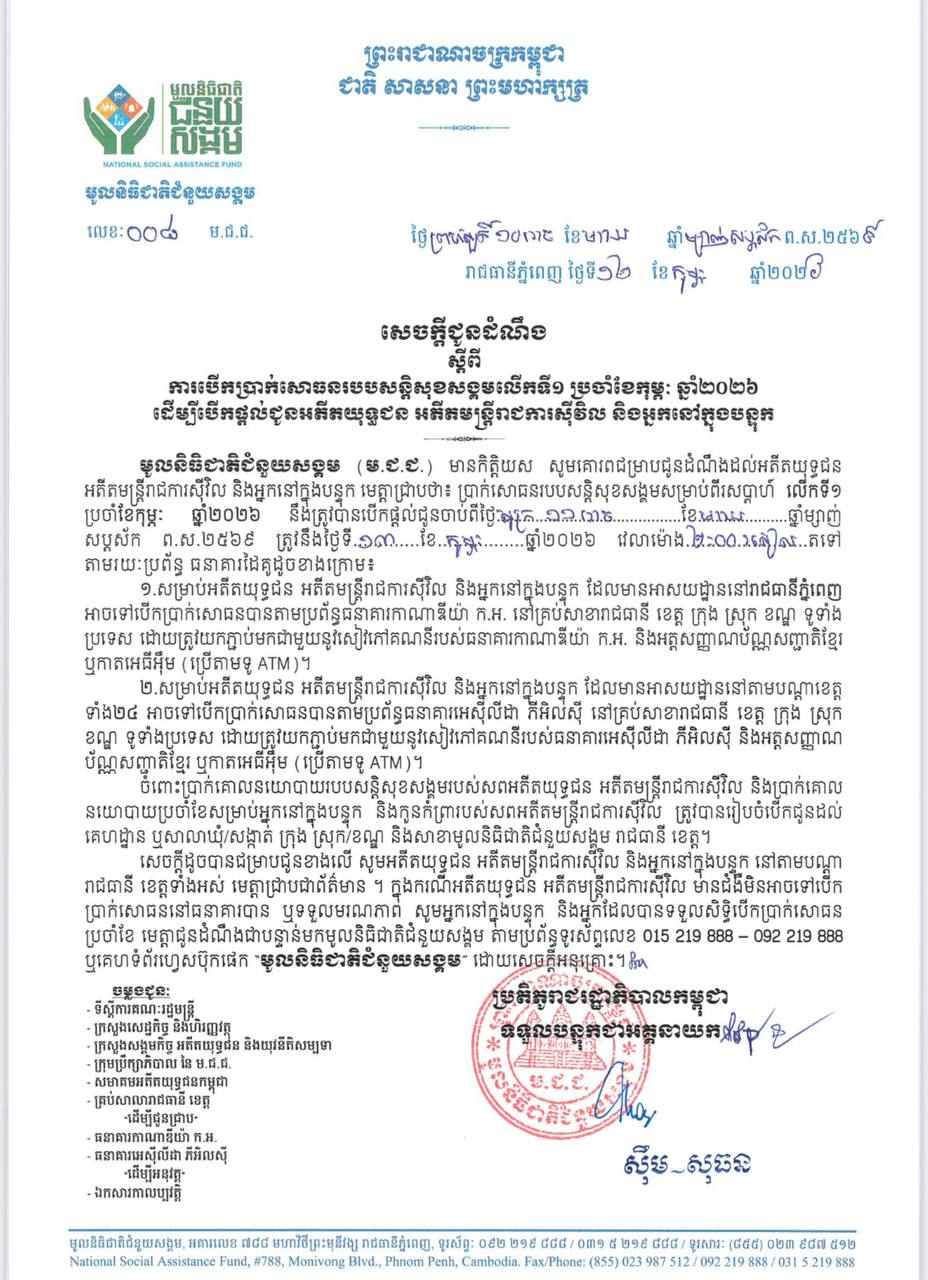 ការបើកប្រាក់របបសន្ដិសុខសង្គមប្រចាំខែកុម្ភៈ ឆ្នាំ២០២៦ លើកទី១ ជូនអតីតយុទ្ធជន អតីតមន្ត្រីរាជការស៊ីវិល និងអ្នកនៅក្នុងបន្ទុក នឹងត្រូវបើកជូននៅថ្ងៃទី១៣ ខែកុម្ភៈ ឆ្នាំ២០២៦ វេលាម៉ោង ២:០០ រសៀលតទៅ។